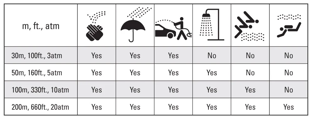 30M or 3ATM water resistance only protects against water splashes as shown on the chart to the left. This does not include any submersion including showering, bathing, swimming or washing dishes.